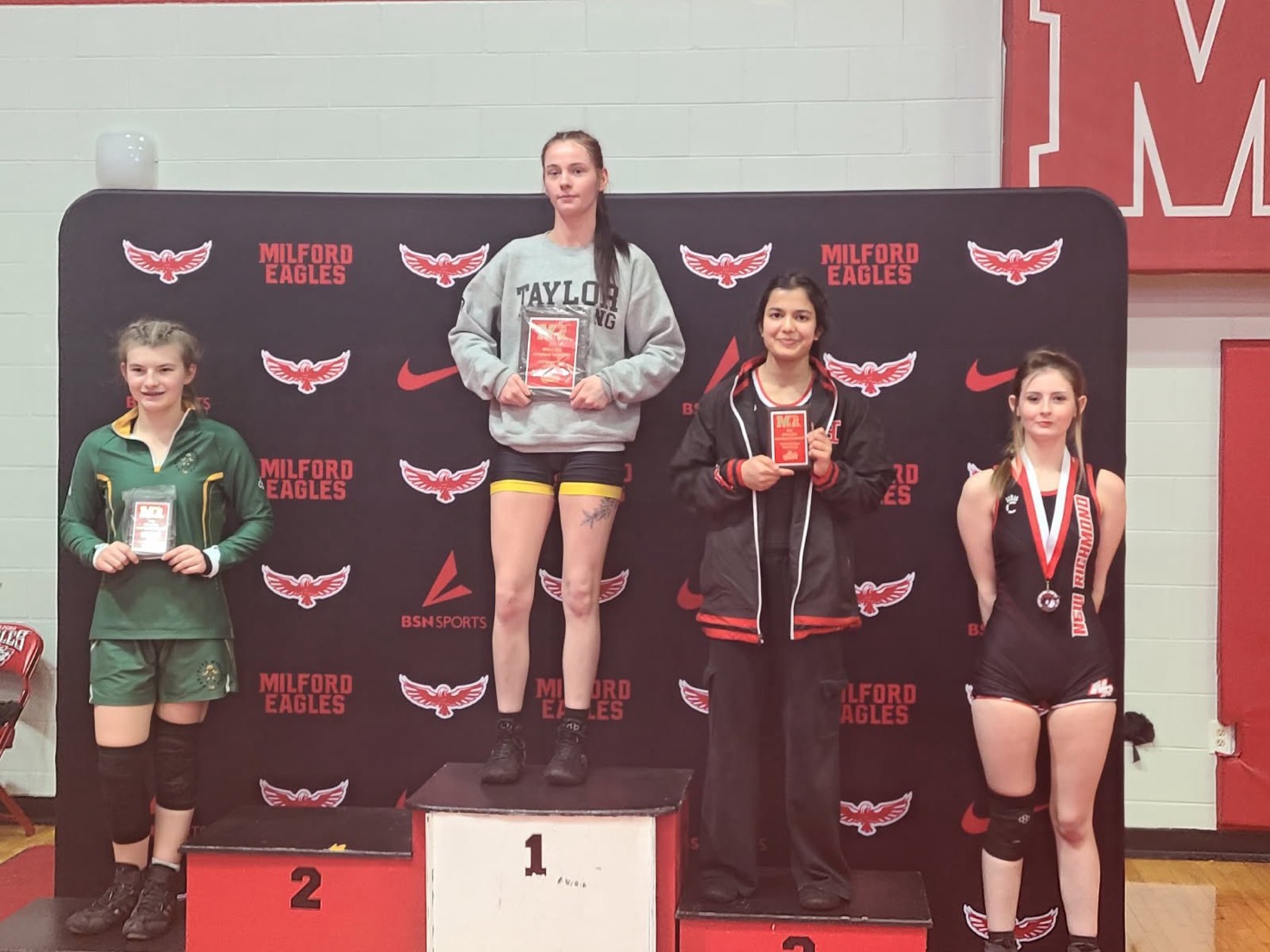 Girls Wrestling: Taylor’s Lisa Carmack won the 105 lb. Division at the Milford Invitational. Lisa is 20-8 on the season with 18 pins.
